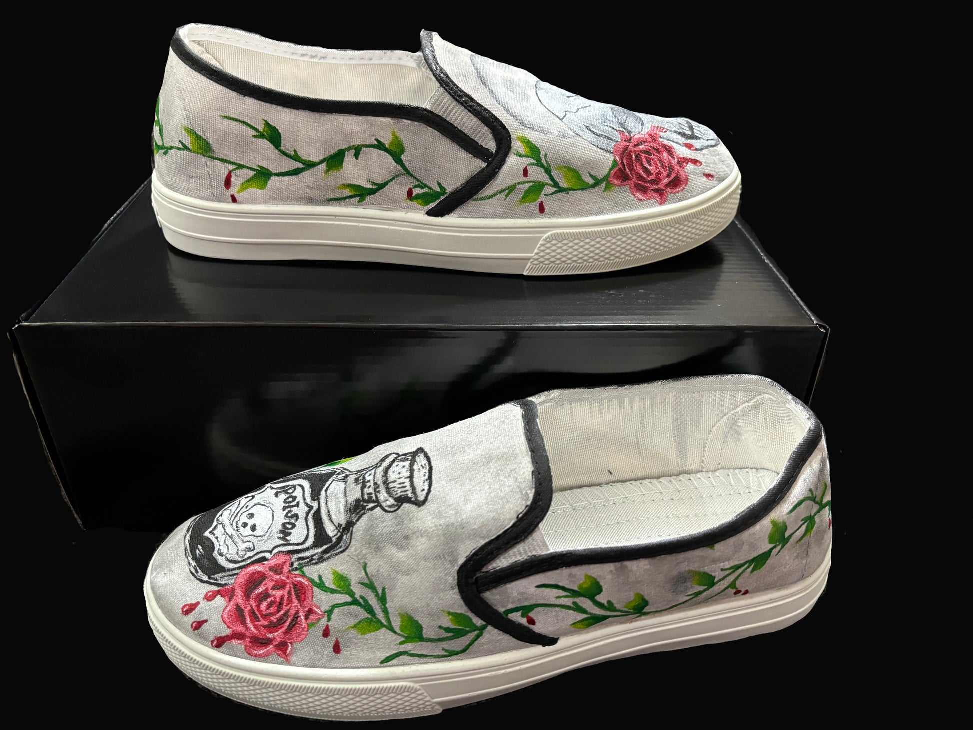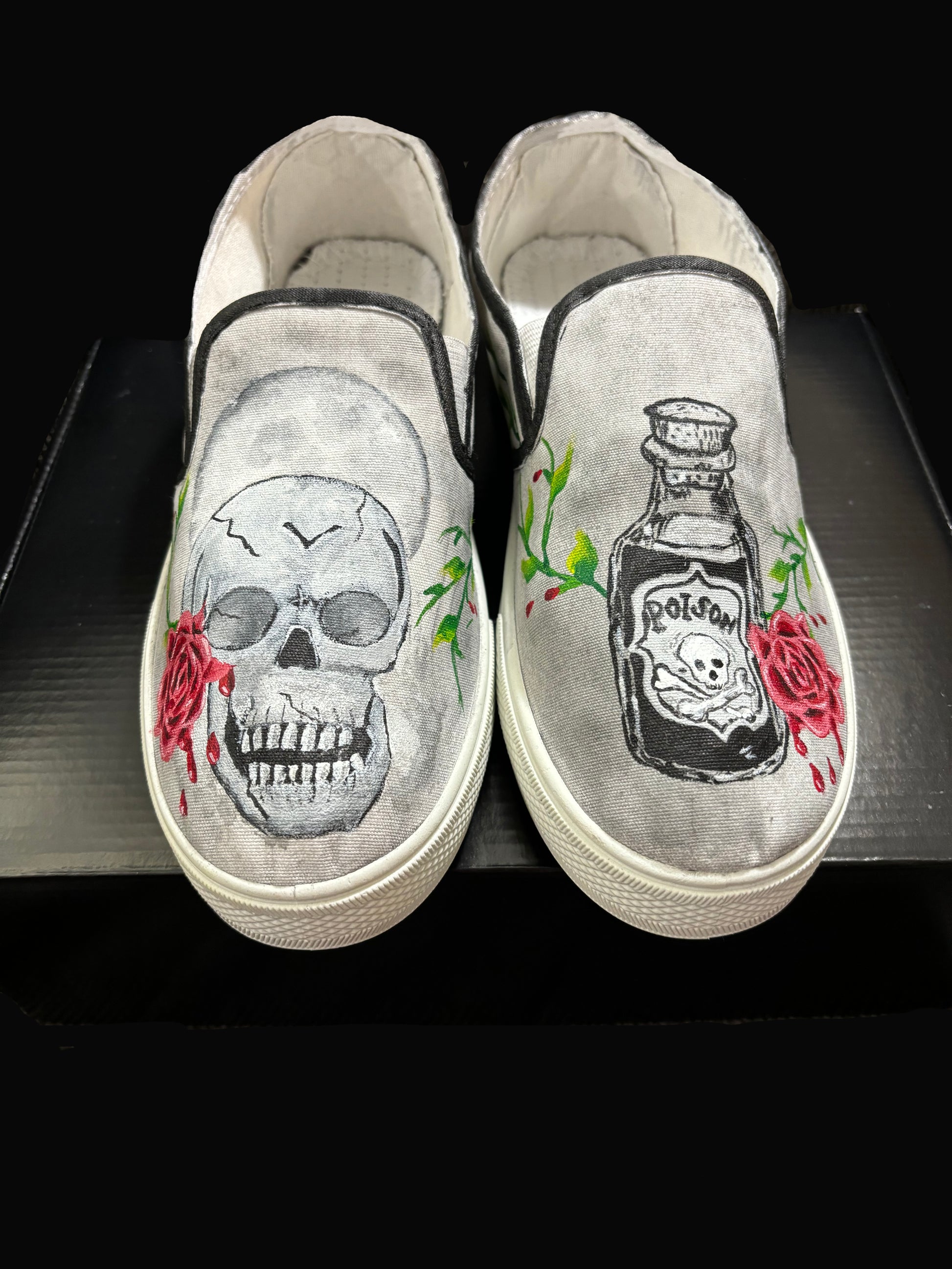 These custom slip-on shoes feature a striking hand-painted skull and poison bottle design, accented by vibrant red roses. The intricate artwork wraps around the sides with delicate vine details, creating a unique, edgy look. Perfect for those who appreciate wearable art with a bold statement!