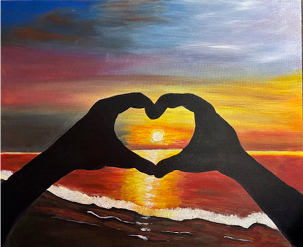 Silhouetted hands form a heart around the glowing sun as it sets over the ocean, casting warm hues of gold, orange, and crimson across the sky and sea. The waves gently kiss the shore, echoing the serenity and passion of the moment. This painting captures the beauty of connection, gratitude, and love—illuminated by nature’s most romantic hour. A radiant reminder of the simple, timeless power of love and light.