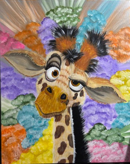 This whimsical giraffe pops off the canvas with a playful, curious expression and bold, cartoonish features. Surrounded by vibrant, fluffy clouds of every color, it looks as if it's daydreaming in a world of imagination. A joyful and eye-catching piece that brings smiles and color wherever it's displayed. Perfect for a kid’s room, nursery, or anyone who loves animals with personality!