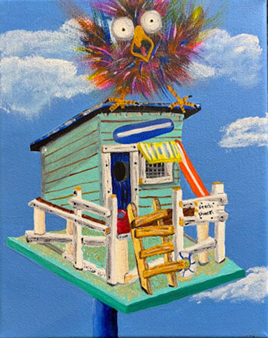 A playful and vibrant painting featuring a whimsical beach shack birdhouse, complete with a little awning and colorful surfboards leaning outside. Perched on top is a hilariously frazzled bird, feathers flying in every direction, eyes wide in shock. The bright colors and lively details bring a sense of humor and beachy fun, making it feel like a perfect day at a quirky seaside escape.