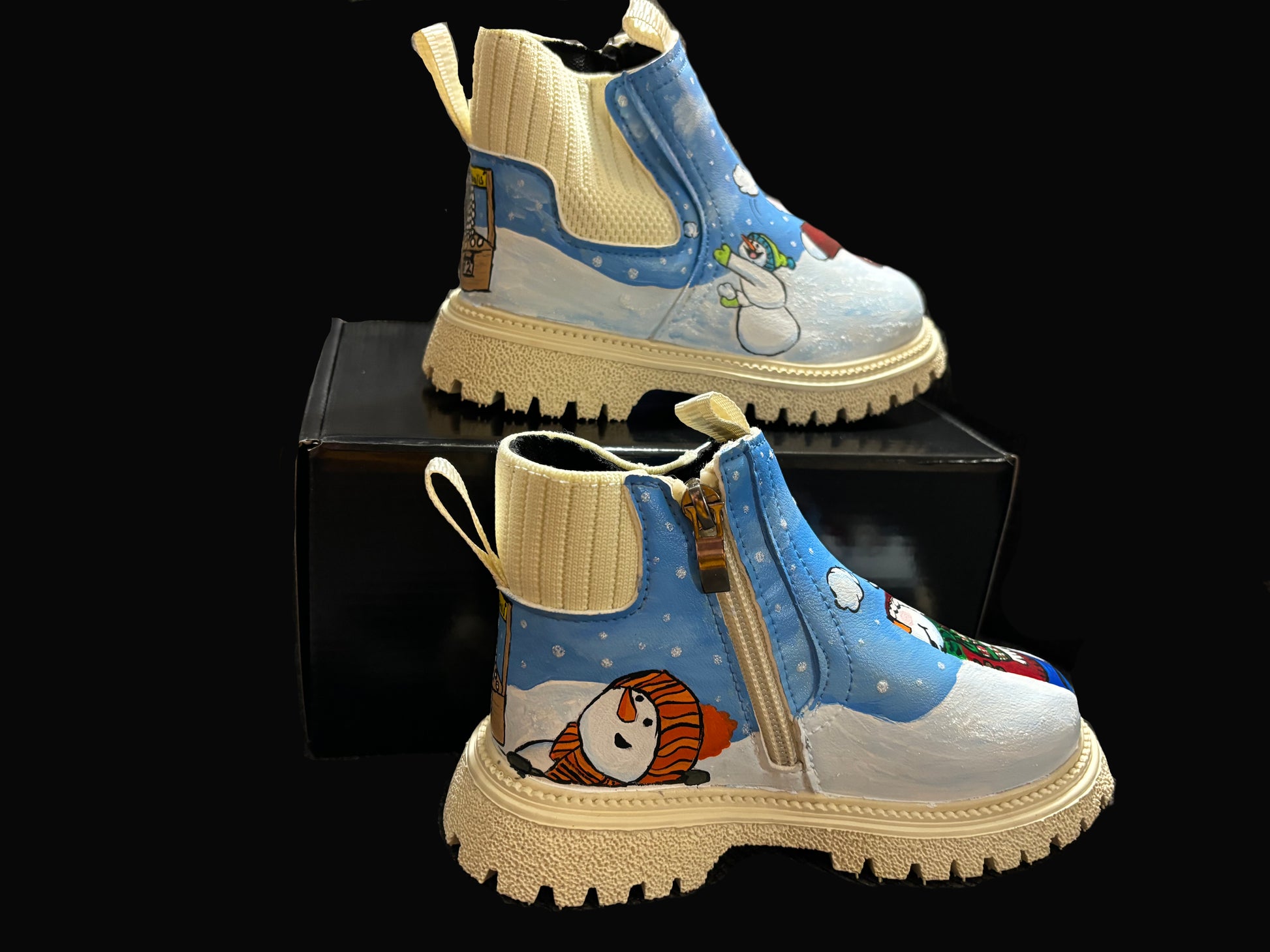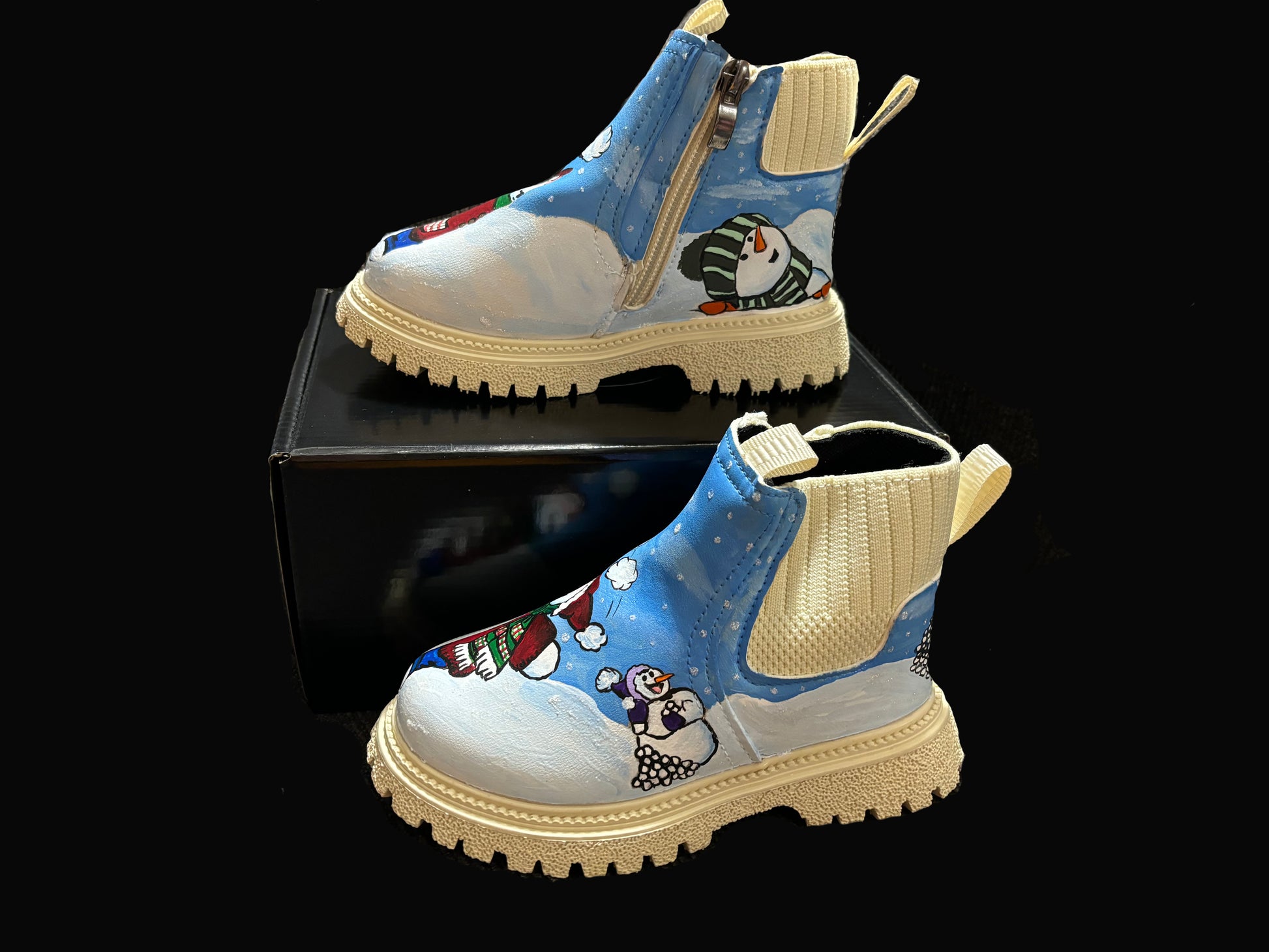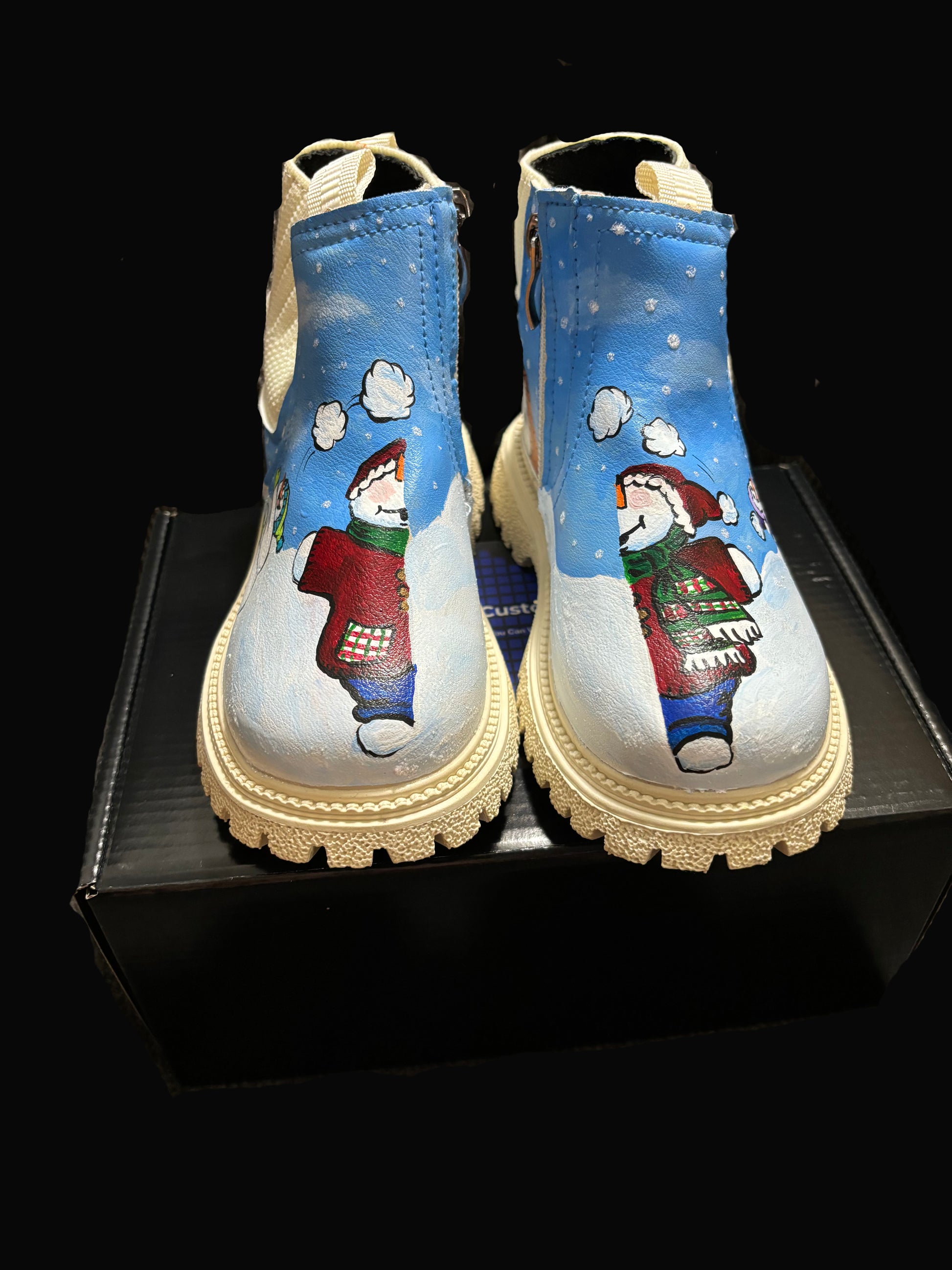 These custom hand-painted boots feature a charming winter scene with snowmen dressed in festive scarves and hats, engaging in playful activities like catching snowballs. The snowy landscape wraps around the boots, with adorable details like a snowball stand on the back, adding a whimsical touch. Perfect for kids to enjoy the winter season in style.