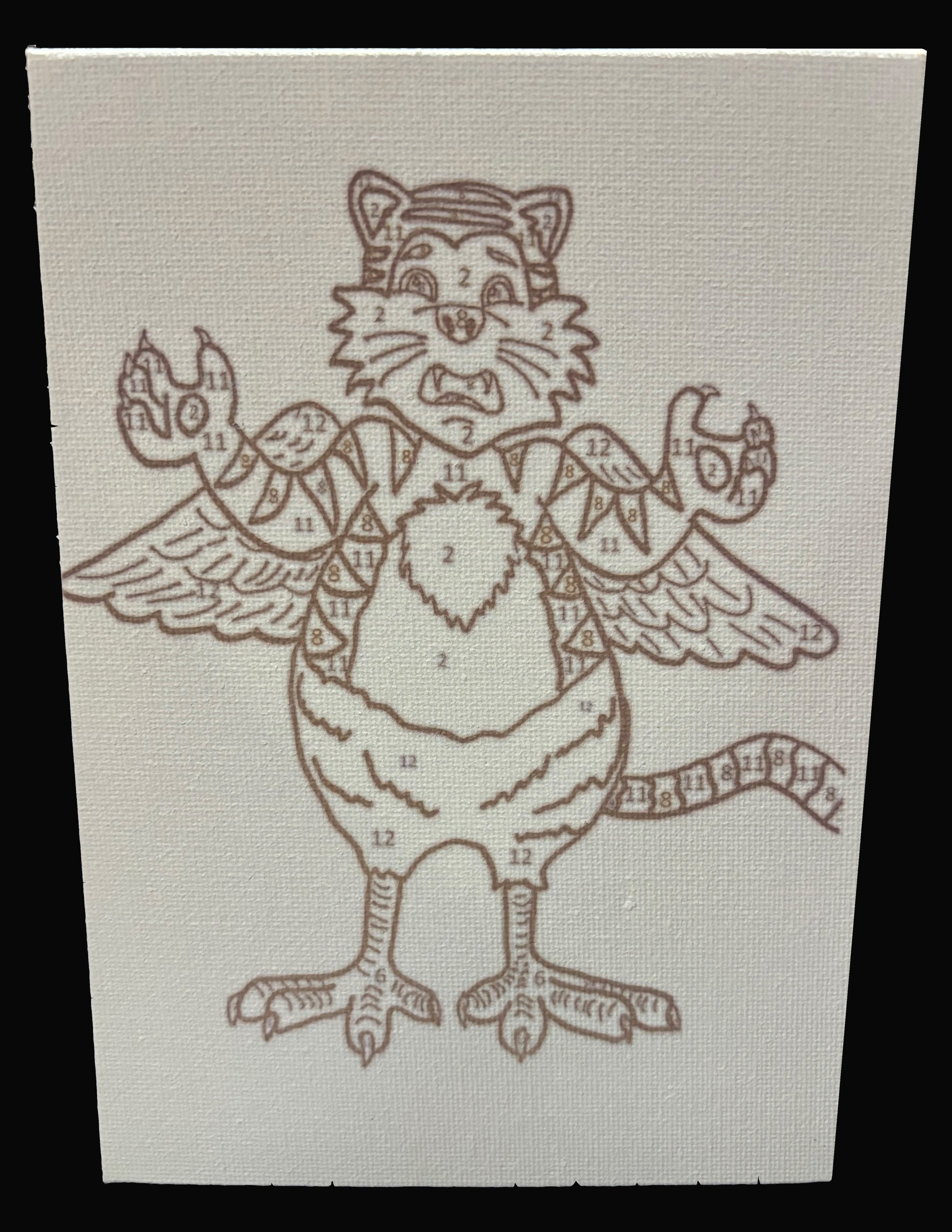 The canvas has a pre-drawn outline of an image, with numbered sections corresponding to specific colors. The detailed line art guides the painter on where to apply each color, making it a fun and structured activity.